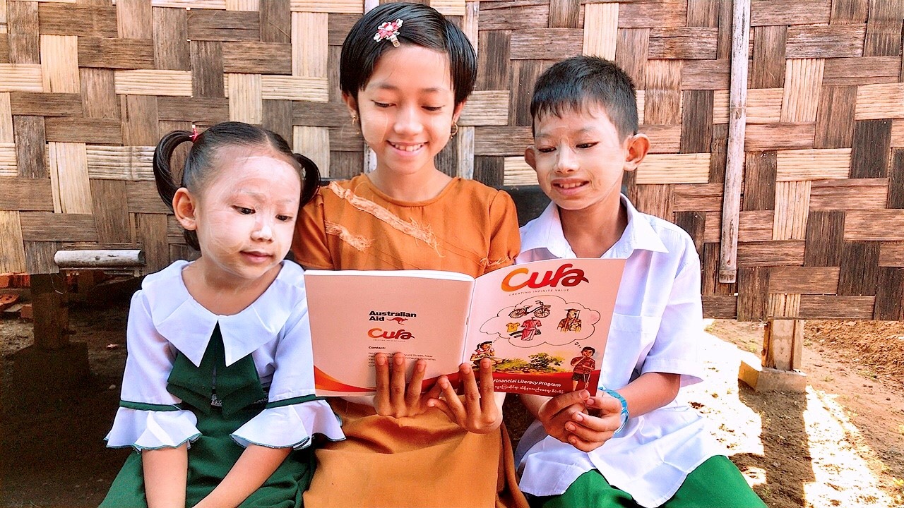 Image: Chit Su reading her Cufa financial literacy booklet to 2 of her firlends.