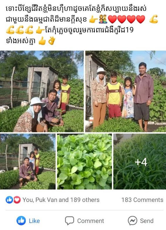 As a result, some of our VEs are now promoting their products online. Among these is Samnang Sok, husband and father of two children, whose business was greatly impacted by Covid.  Since 2018, Samnang has been an active VE member, receiving financial support to expand his vegetable farm thanks to his Community Investor in Australia. During the pandemic in 2020, Samnang, along with many of his fellow VEs, was able to rapidly adapt to the pandemic through sanitation methods and social distancing, but as 2021 brought a higher number of Covid cases to Cambodia, the recent lockdown measures threatened his sales.